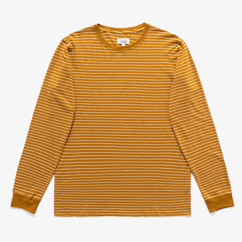 Yarn dye stripe linen blend, Long sleeve, Vintage wash, Back neck and shoulder seam cover stitch, Recycled polyester woven labels, FSC approved paper swing tags.